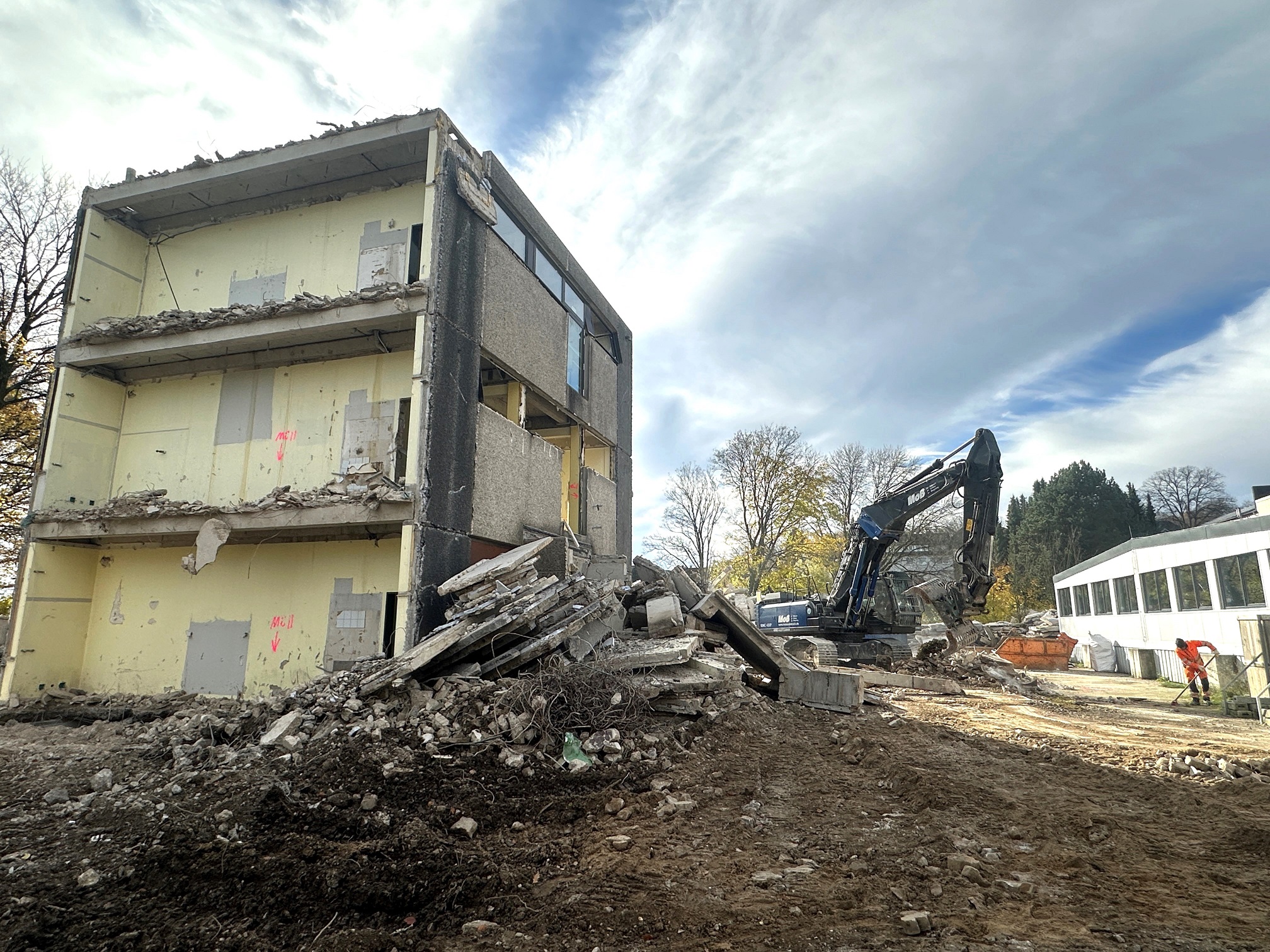 Ab Montag, 10. November, schreitet dann der Rückbau des noch verbliebenen Gebäudes der ehemaligen Grundschule-Ost voran. Das ist der Gebäudeteil, der an der Zuwegung zum Gelände von der Wirtsmühler Straße grenzt und an dem entlang ein Gehweg verläuft.