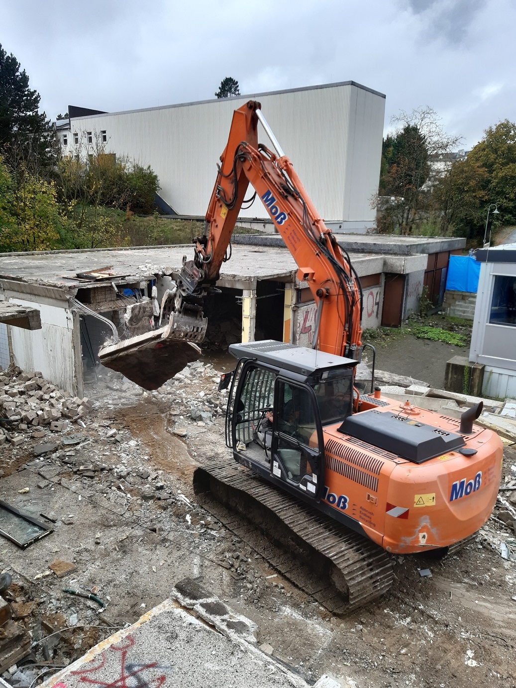 Zuletzt standen noch bis in die erste Herbstferienwoche notwendige Fräsarbeiten an den Abrissgebäuden an, damit die Bagger zum Einsatz kommen können. Dadurch wurden Soll-Bruch-Stellen in die Betonwände gesetzt, um den Rückbau Stück für Stück zu ermöglichen. Anschließend konnte die Einrüstung der Gebäude entfernt und der Startschuss für das schwere Gerät gegeben werden.