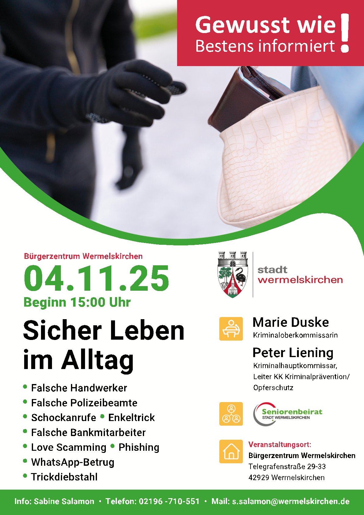Alle interessierten Bürgerinnen und Bürger sind herzlich zu dem informativen Nachmittag zum Thema „Sicher leben im Alltag“ eingeladen. Der Eintritt ist frei. Fragen beantwortet vorab gerne Sabine Salamon von der Fachstelle „Älter werden“ per Mail an s.salamon@wermelskirchen.de oder telefonisch unter 02196 / 710-551.