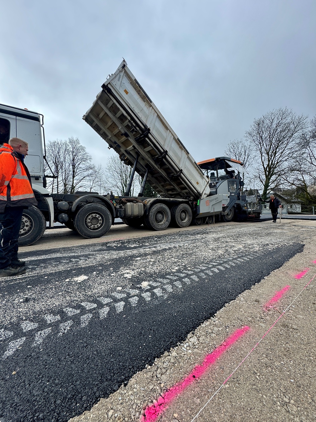 „Gefüttert“ von den Ladeflächen der Lkw brachte ein sogenannter „Asphaltfertiger“ Bahn für Bahn auf, um die neue Fläche zu schaffen. Ein Laser an der Spezialmaschine sowie die Maschinisten richteten sich dabei an zuvor über den Boden gespannten Schnüren aus. Die Vorgabe: Nach dem Verdichten mit der Walze musste die Asphaltschicht mindestens eine Dicke von acht Zentimetern haben.