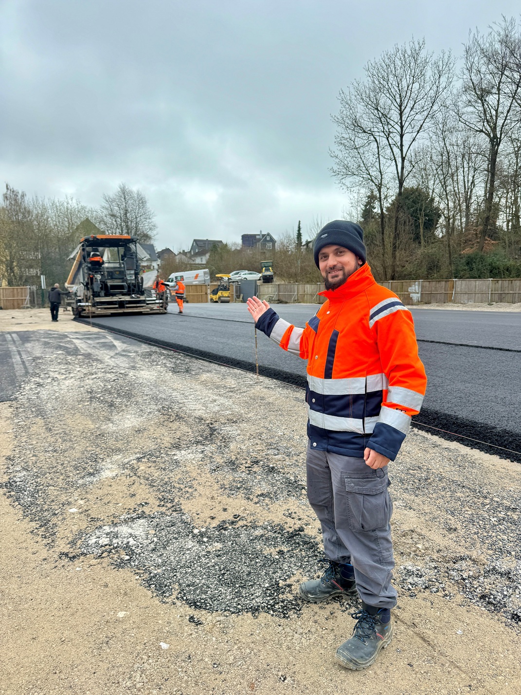 „Eine Besonderheit bei dieser Asphaltfläche ist, dass es keine Einfassung der Ränder wie beispielsweise beim Straßenbau gibt. Alle Flächen gehen nach Fertigstellung nahtlos ineinander über“, sagt Bayram Hüseyinoglu, der beim Tiefbauamt für die Außenanlagen der städtischen Gebäude zuständig ist. Er rechnet vor: „Hier sind rund 220 Tonnen Asphalt aus dem Mischwerk angefahren und eingebaut worden. Ein Lkw transportiert zwischen 20 und 25 Tonnen.“