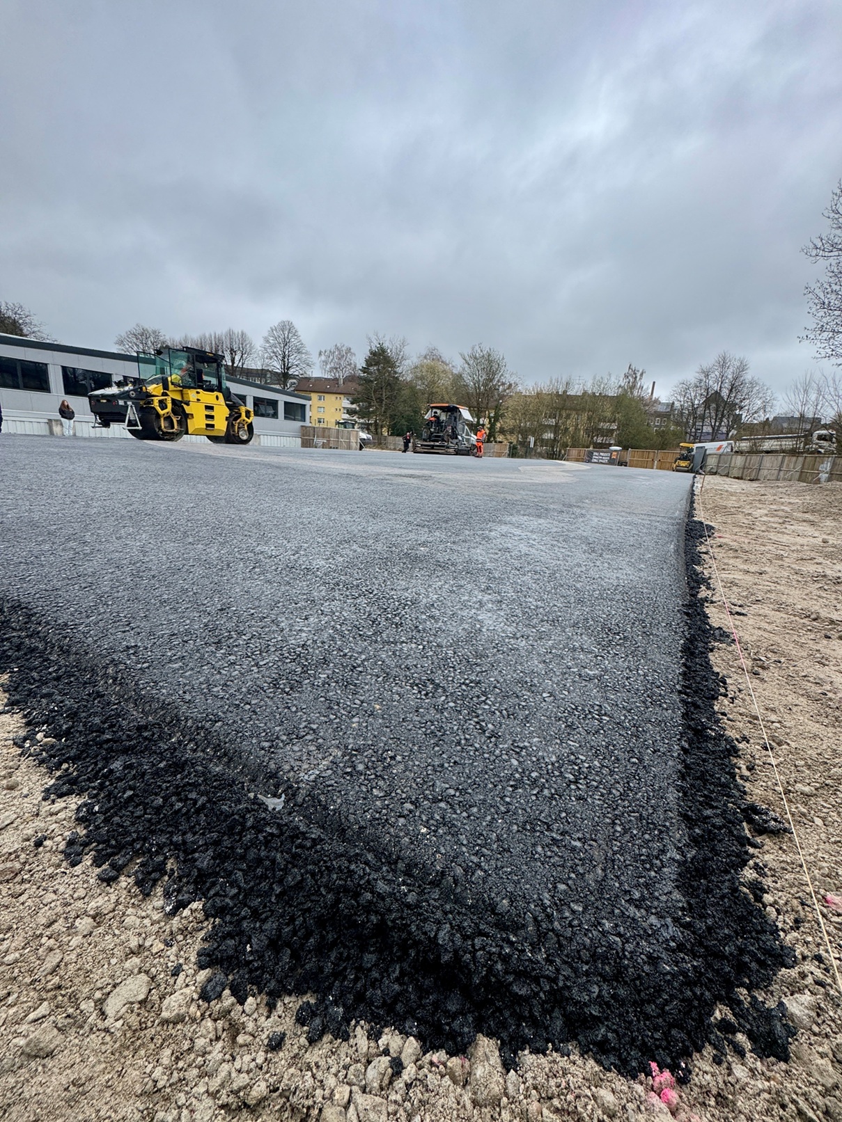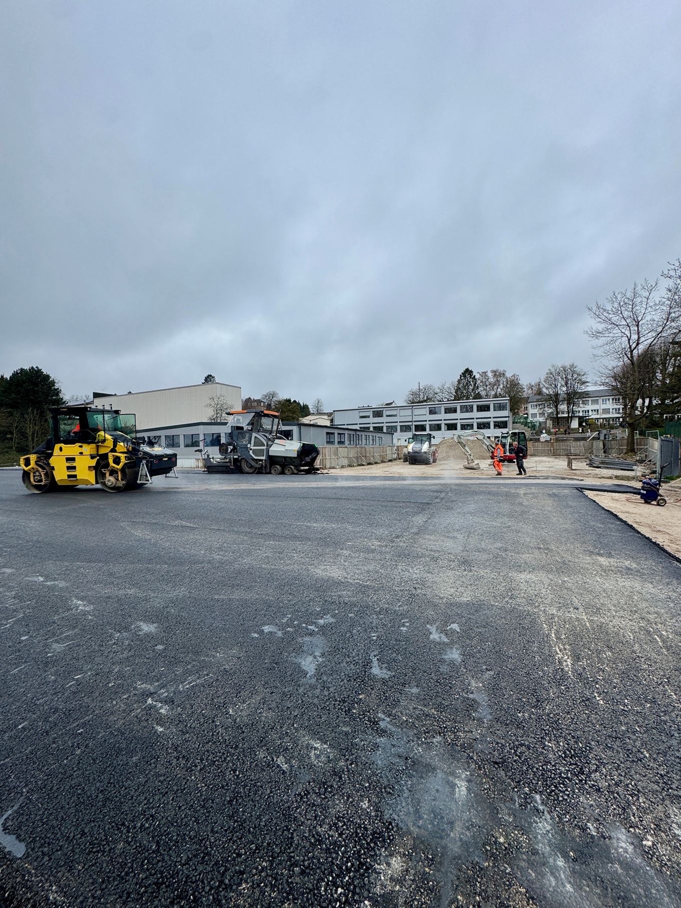 Nachdem das Winterwetter zuletzt keinen Frost mehr brachte, konnten die Arbeiten für den Schulhof-Ausbau beginnen. Fünf Tage Vorbereitung waren nötig, um schließlich innerhalb von nur einem Tag die Asphaltdecke aufzubringen. Die bedeckt einen großen Teil der Fläche der ehemaligen Grundschule.
