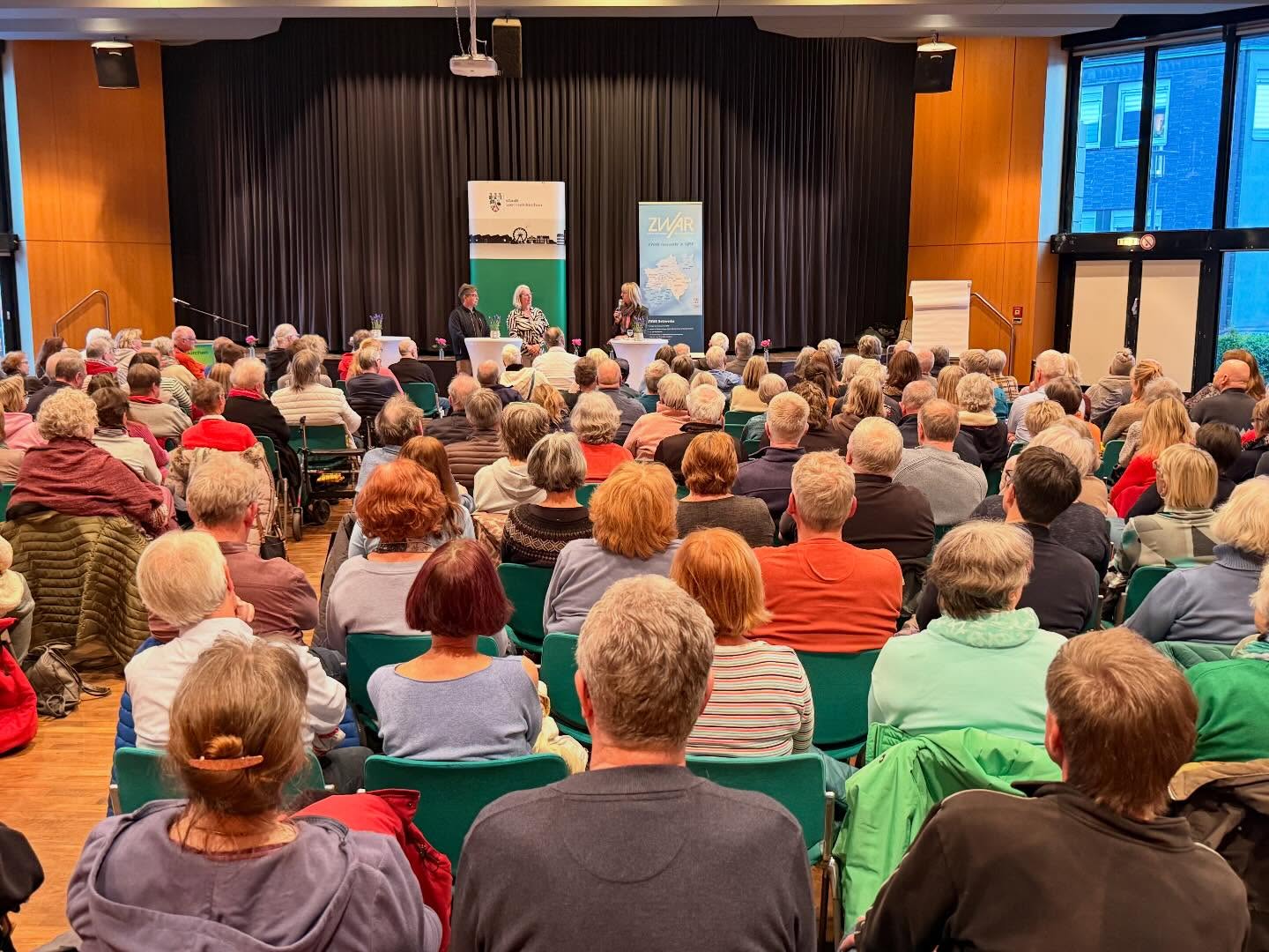 Kommen 50 oder 420 Interessierte? Die Mitarbeiterinnen der Stadtverwaltung hatten im Vorfeld Wetten darüber abgeschlossen, wie viele Menschen der Einladung zur Gründungsveranstaltung des neuen ZWAR-Netzwerks folgen würden. Entsprechend gespannt standen sie an den Eingängen des Rathauses bereit, um die Bürgerinnen und Bürger als lebendige Wegweiser in den großen Ratssaal zu lotsen. Doch die Orientierung fiel leicht: Die zahlreichen Interessierten brauchten lediglich dem stetigen Besucherstrom zu folgen, der bis zum Beginn der Veranstaltung nicht abbrach. Rund 320 Menschen waren es schließlich, die Platz nahmen, sich für „Zwischen Arbeit und Ruhestand“ (ZWAR) interessierten und wissen wollten: Was ist ein ZWAR-Netzwerk und was bringt mir das ganz persönlich in meinem Leben rund um den Ruhestand?