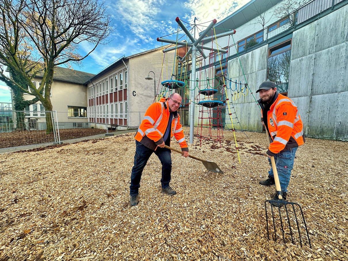 Damit der Kletterspaß möglichst sicher ist, haben die Betriebshofmitarbeiter eine Hackschnitzelschicht aufgebracht. Die ist übrigens „weicher“ als vorgeschrieben, denn über die vorschriftsmäßigen 40 Zentimeter Dicke hinaus, ist etwas mehr Material genutzt worden, sodass die Schicht zwischen 50 und 60 Zentimeter stark ist.