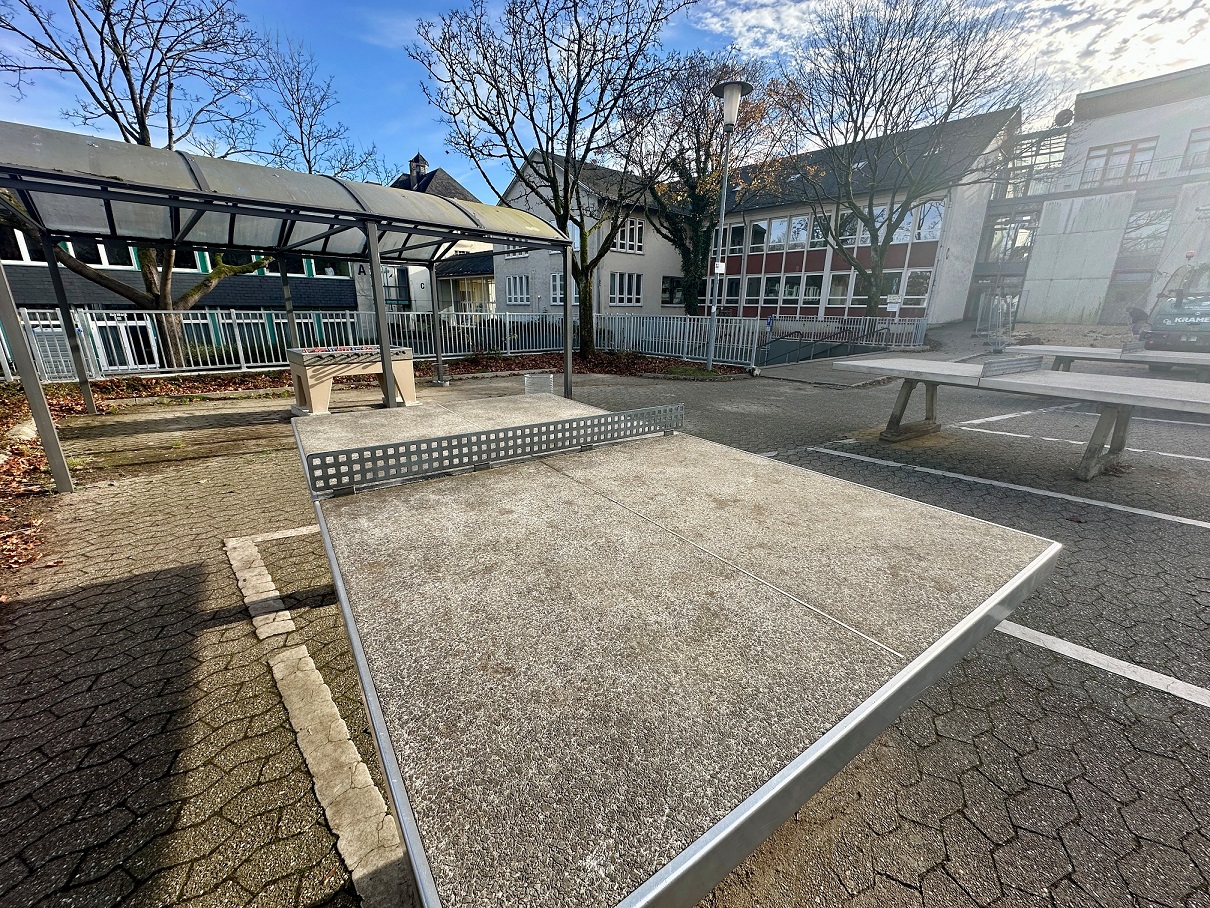 Nachdem bereits drei bei den Schülerinnen und Schülern überaus beliebte Tischtennistischen und unter der Überdachung der ehemaligen Fahrrad-Abstellstation ein Tischkicker platziert wurde, ist nun auch das Kletter-Spielgerät einsatzbereit: Damit ist die durch einen Zaun vom Heinrich-Heine-Parkplatz abgetrennte Schulhof-Erweiterung am Städtischen Gymnasium fertig umgestaltet.