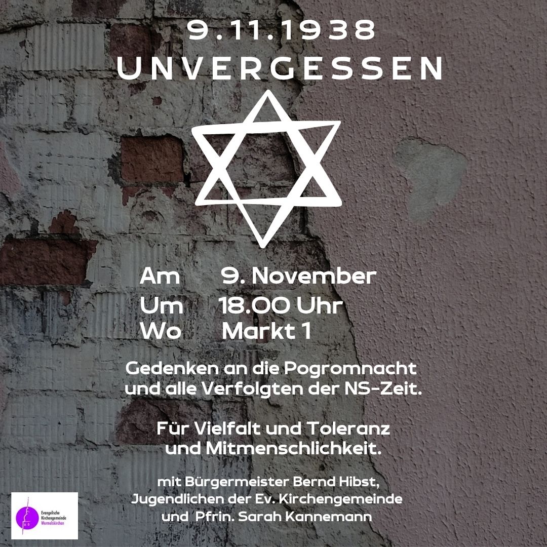 Unter dem Titel „Unvergessen“ lädt die Evangelische Kirchengemeinde Wermelskirchen am Sonntag, 9. November, um 18 Uhr zu einer Gedenkveranstaltung zur Reichspogromnacht und alle Verfolgten der NS-Zeit an den Markt ein. In diesem Jahr wird das Gedenken von Pfarrerin Sarah Kannemann gestaltet, Bürgermeister Bernd Hibst hält ein Grußwort.