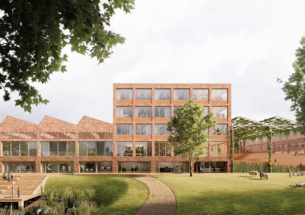 Die historische Sheddach-Fassade wird erhalten und aufgenommen: zum einen als Sheddach-Tragwerk für die Schwimmhalle, für eine begrünte Teilüberdachung des Quartiersplatzes und für den daran angrenzenden östlichen Teil des Innovationshauses, die diese Räume gestalterisch zusammenbindet; zum anderen in der Materialität der Fassaden mit Ziegeln die teilweise für die Gebäude im Quartier aufgegriffen werden.